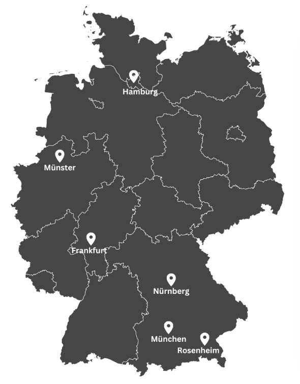 Wir betreiben 6 Filialen in Deutschland mit einem Abdeckungsradius von 100 km: